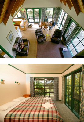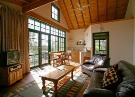 Most of the cottages have valley views, large verandahs, and cathedral ceilings with loft bedrooms that will appeal to children. Natural timber is also featured in the kitchens and ceilings and chunky outdoor settings. The interiors are simply and comfortably furnished featuring practical leather lounge suites, and the flooring is a combination of cork and carpet.