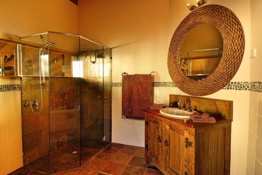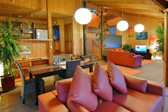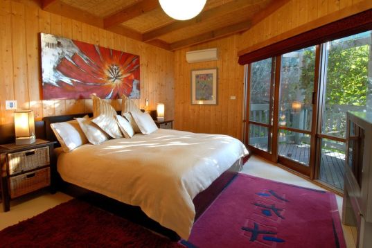 Skyview Penthouse occupies the upper level with the spaciousness of a penthouse. There are 14 squares of floorplan including two decks. The central focus of the apartment is the living area with the most commanding views along its length through double glazed, tinted windows up to 3 metres in height. There is plenty of room to spread out with a lounge at one end of the room, while at the other end is an oversized leather couch positioned for the absolute best view in the house. Just behind the couch is a full size dining suite and a fully equipped kitchen a few steps higher overlooking the entire scene. Soaring ceilings make the area feel even more spacious, while Baltic pine lining, furnishings in autumn colours, a wood fire, rich oil paintings and lamps introduce earthy warmth and intimacy. The large deck in front reaches 8 metres above ground level adding an extra tree house dimension to the room. There is a second smaller deck off the bedroom.