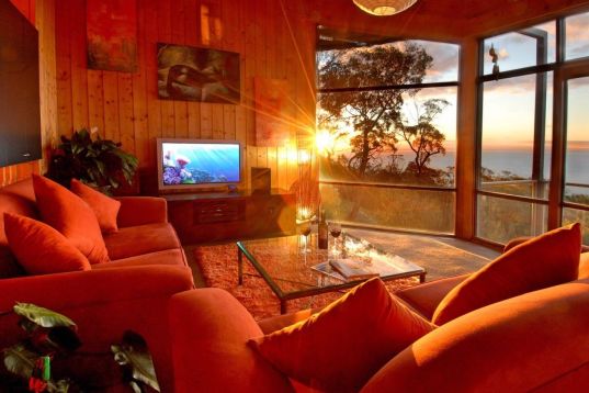 Arthur's Seat lays claim to the most spectacular lookout on the Mornington Peninsula and Summit Views Skyview Penthouse is one of the precious few addresses that has a view that some say is even better than the renowned lookout. The architect designed, multi-level, western red cedar residence hugs the steep terrain near the peak and features north-facing, full length glass walls to capture 180 degree views.