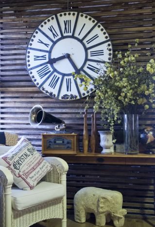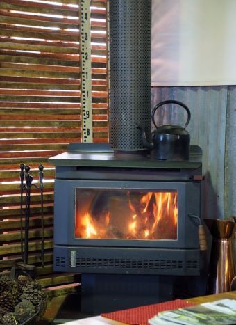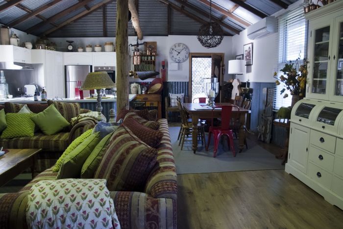 The interior has preserved some of the original elements as the foundation for its rustic character, including exposed roof trusses and corrugated iron. The timber slat partition walls, which separate the bedroom and ensuite from the living area, also reflect the era. Well chosen farmhouse furniture, antiques and a sprinkling of art work elevate the interior style. The ensuite floor has inlaid black pebbles, a white claw foot bath and pedestal basin, creating an appealing combination of old and new. The large, modern kitchen has glossy white cabinets with a U-shaped bench area, and stainless steel appliances. A collection of earthenware atop the cupboards, and a wooden butcher's block, bridge the decor as does the large white buffet hutch beside the solid timber dining table.