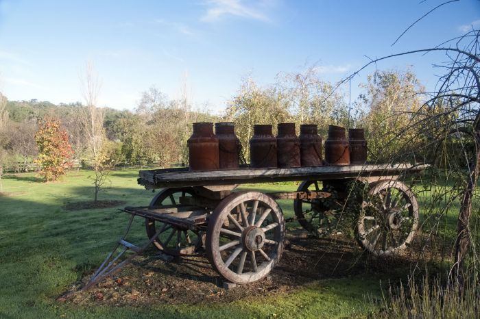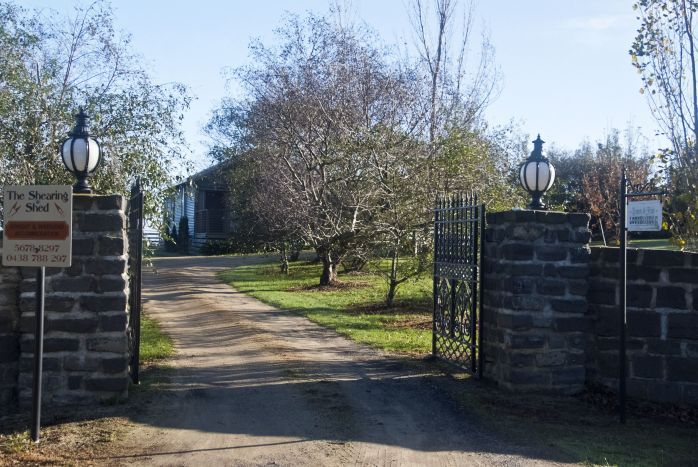 Bluestone walls flank the wrought iron gates at the entrance to this 100 acre farm.The Shearing Shed is encountered soon after you enter the property. Opposite the front deck is an informal garden area through a rose arbor adjoining a hedge.A collection of trees are establishing themselves in the expanse of lawn and an old tray wagon makes an interesting sculptural feature.
